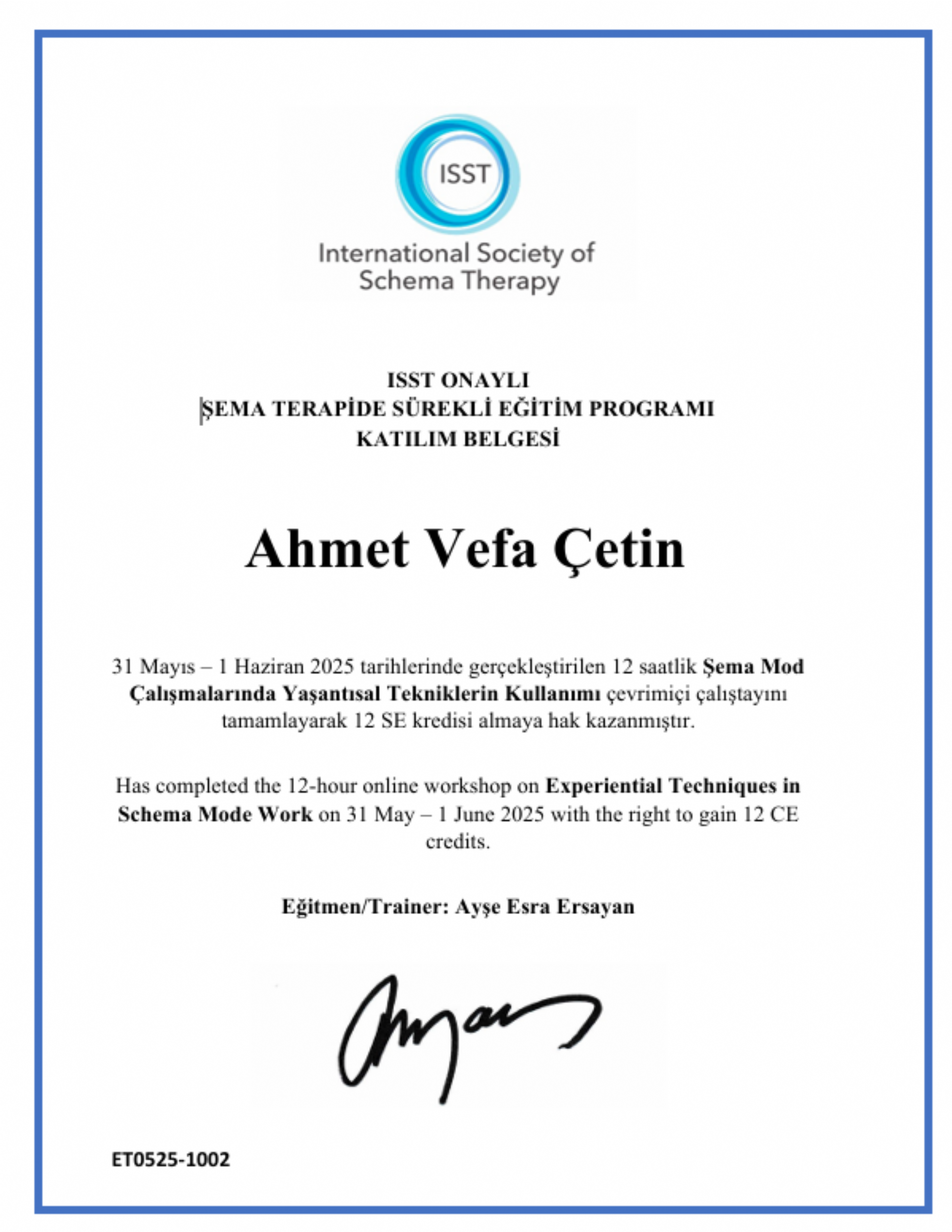 Şema Terapi yaklaşımında ise teorik eğitimini tamamlamış olup süpervizyon sürecine devam etmektedir. Bu süreçte ayrıca Uluslararası Şema Terapi Birliği (ISST) onaylı bir terapist eşliğinde kendi kişisel terapi sürecini de tamamlamıştır.
