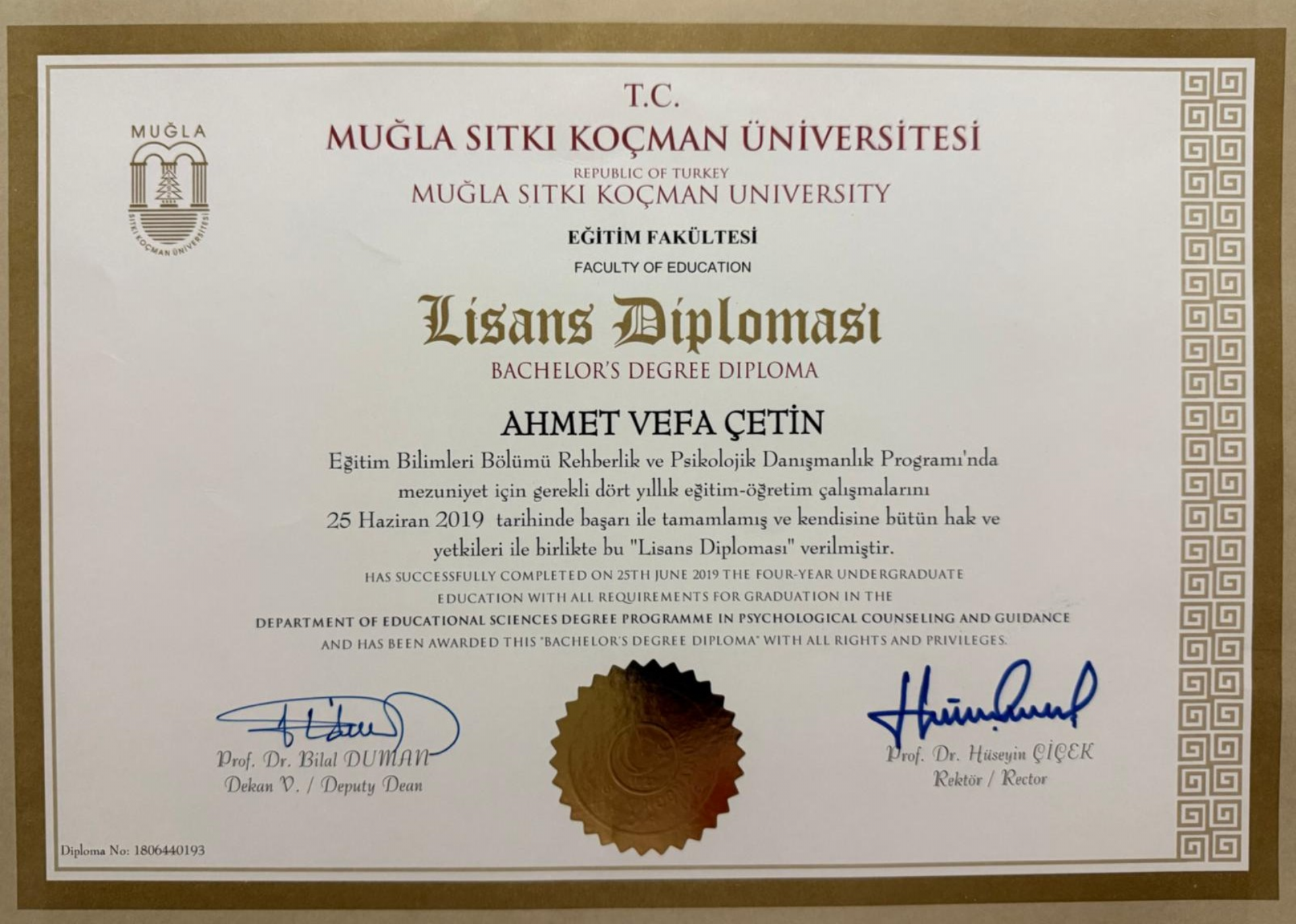 Ahmet Vefa Çetin, Muğla Üniversitesi Psikolojik Danışmanlık ve Rehberlik bölümünden mezun olduktan sonra Üsküdar Üniversitesi’nde Klinik Psikoloji yüksek lisansını tamamlamıştır.