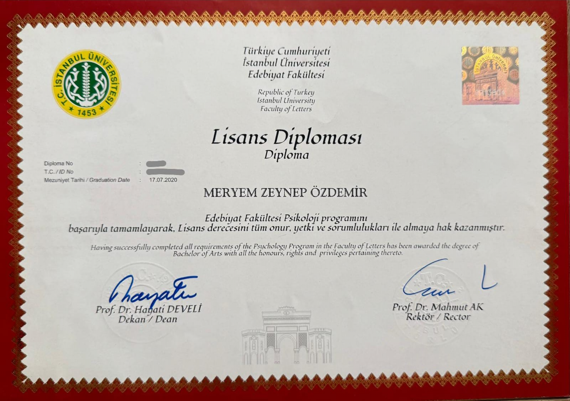 Meryem Zeynep Çetin, İstanbul Üniversitesi Psikoloji Bölümü’nden mezun olmuş ve Üsküdar Üniversitesi’nde Klinik Psikoloji yüksek lisansını tamamlamıştır.