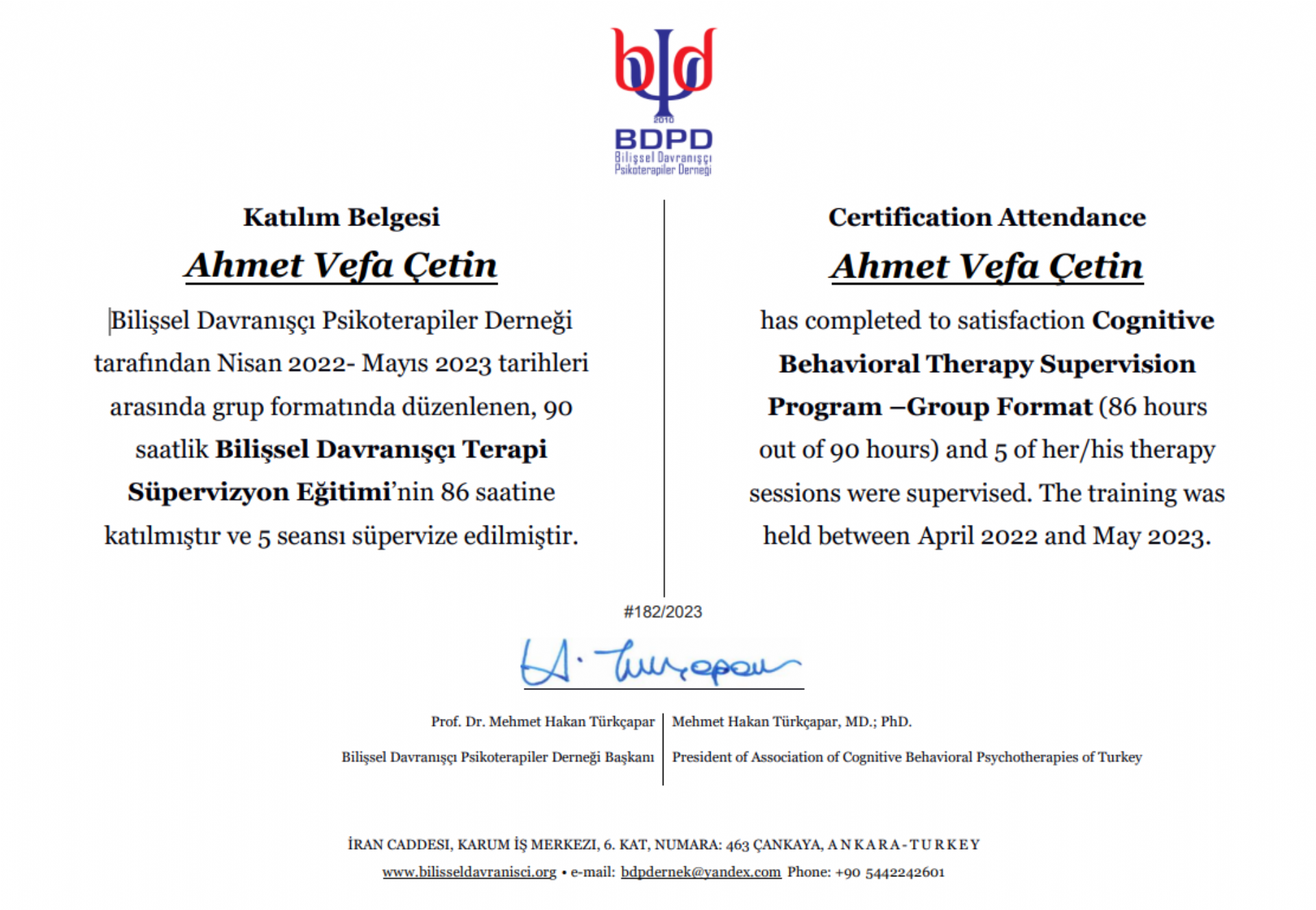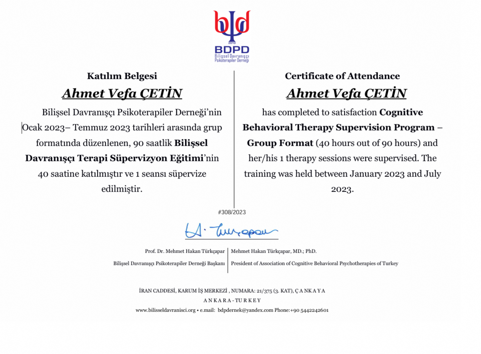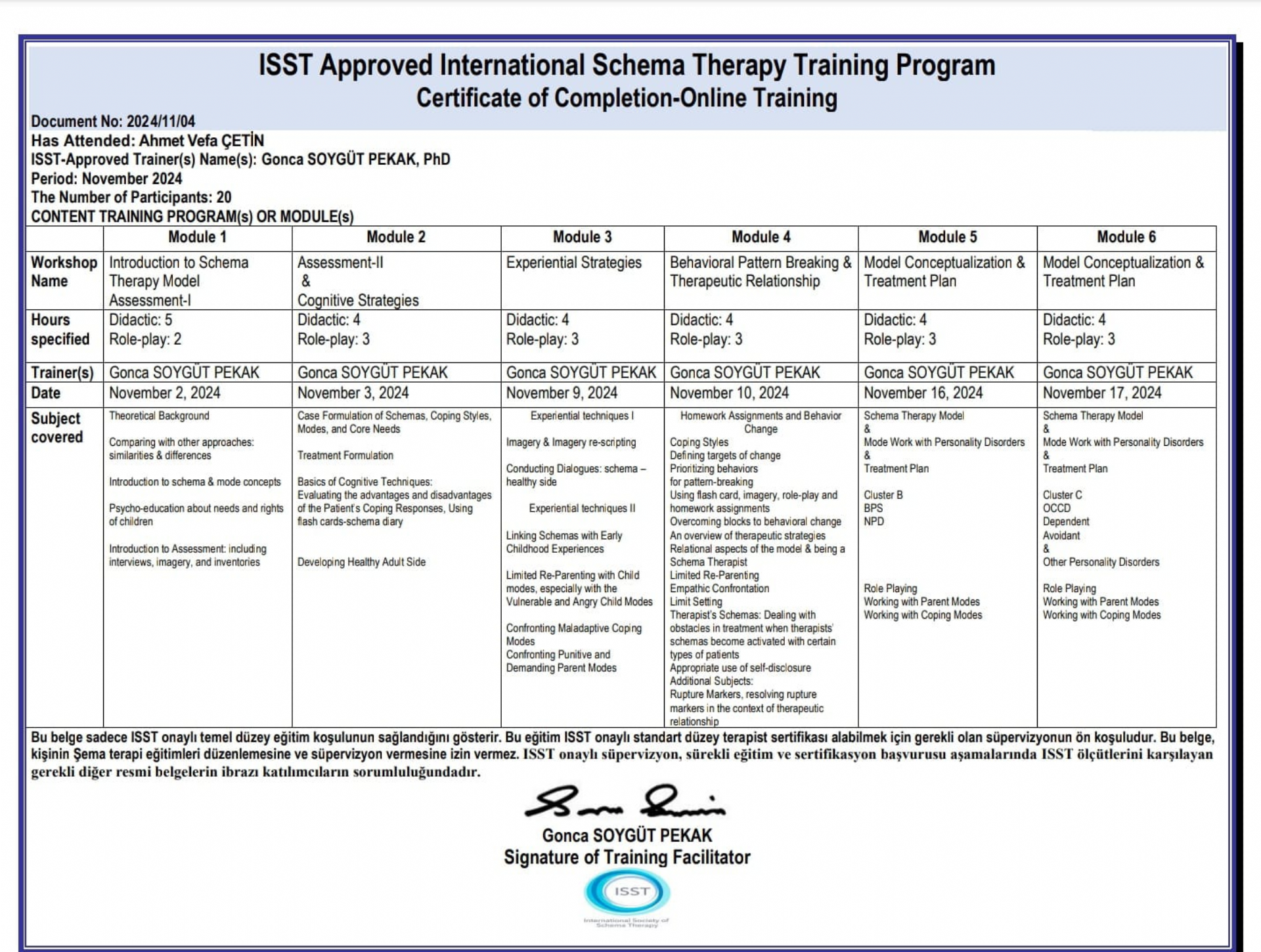 Şema Terapi yaklaşımında ise teorik eğitimini tamamlamış olup süpervizyon sürecine devam etmektedir. Bu süreçte ayrıca Uluslararası Şema Terapi Birliği (ISST) onaylı bir terapist eşliğinde kendi kişisel terapi sürecini de tamamlamıştır.