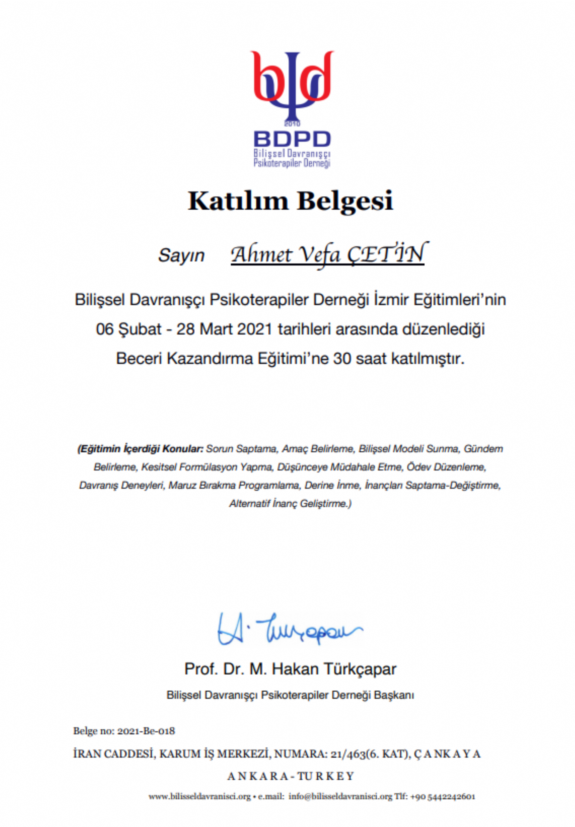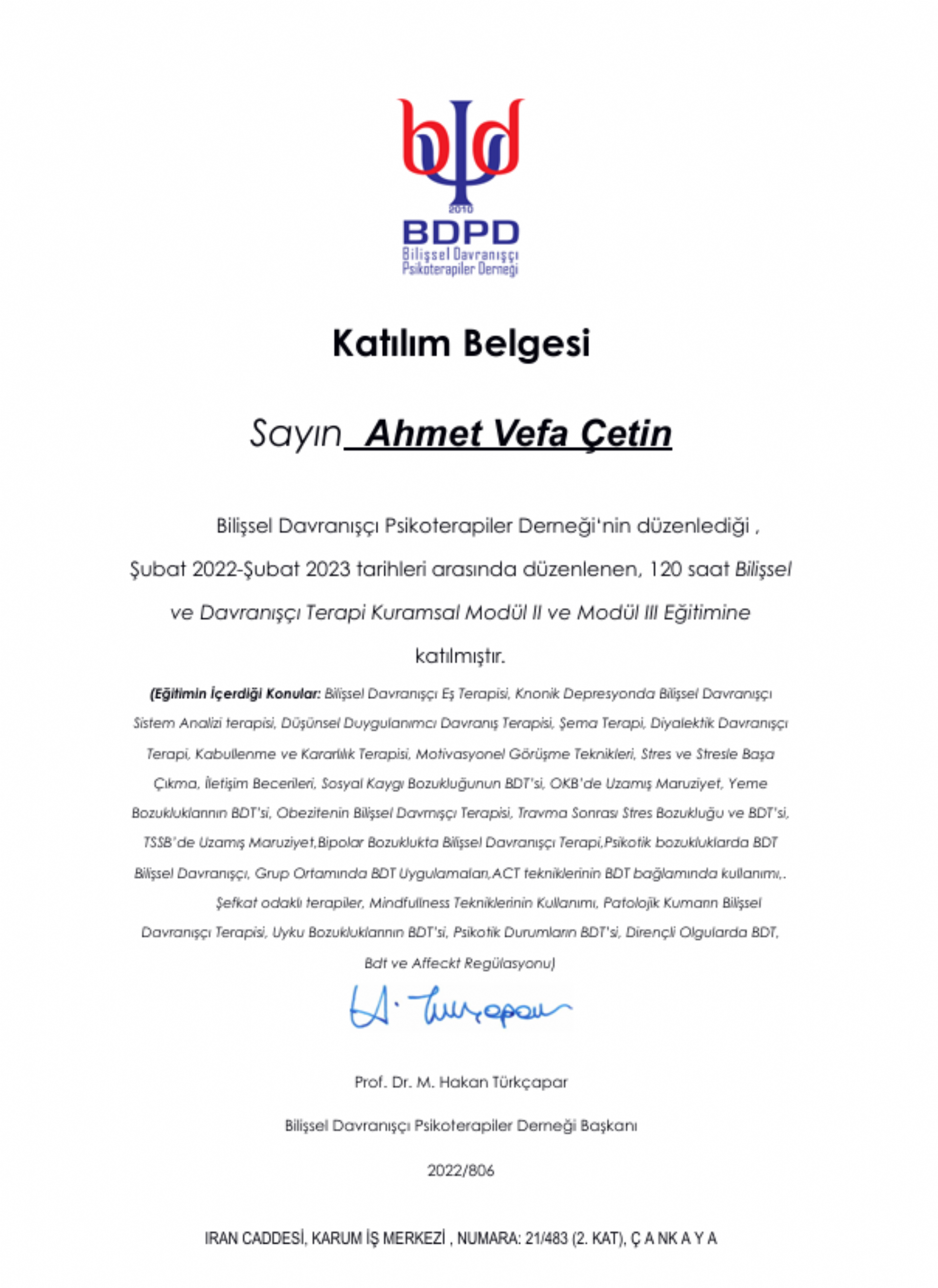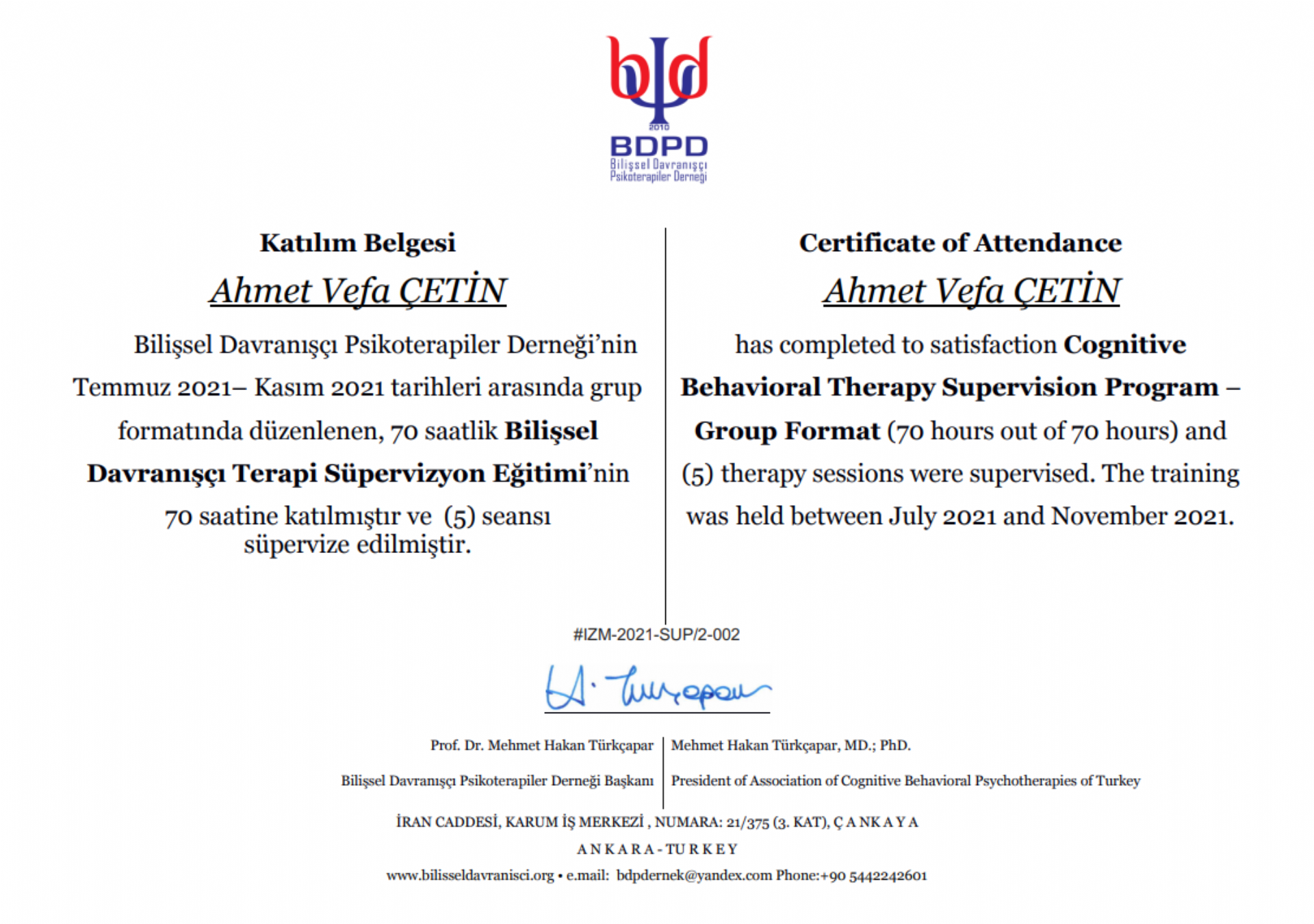 Şema Terapi yaklaşımında ise teorik eğitimini tamamlamış olup süpervizyon sürecine devam etmektedir. Bu süreçte ayrıca Uluslararası Şema Terapi Birliği (ISST) onaylı bir terapist eşliğinde kendi kişisel terapi sürecini de tamamlamıştır.